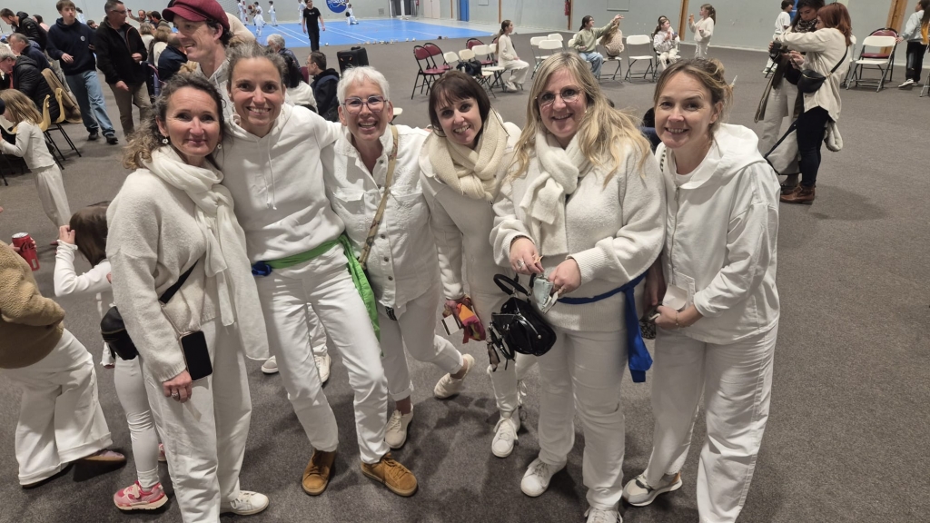 Beau moment tous ensemble habillés en blanc avec une ceinture de couleur.